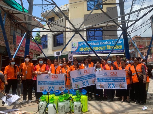 The awareness campaign against dengue began from Ward No. 16 of Kathmandu Metropolitan City. As part of the campaign, activities include raising awareness about dengue, providing information on mosquito control, and fumigating areas to destroy mosquitoes and their larvae.